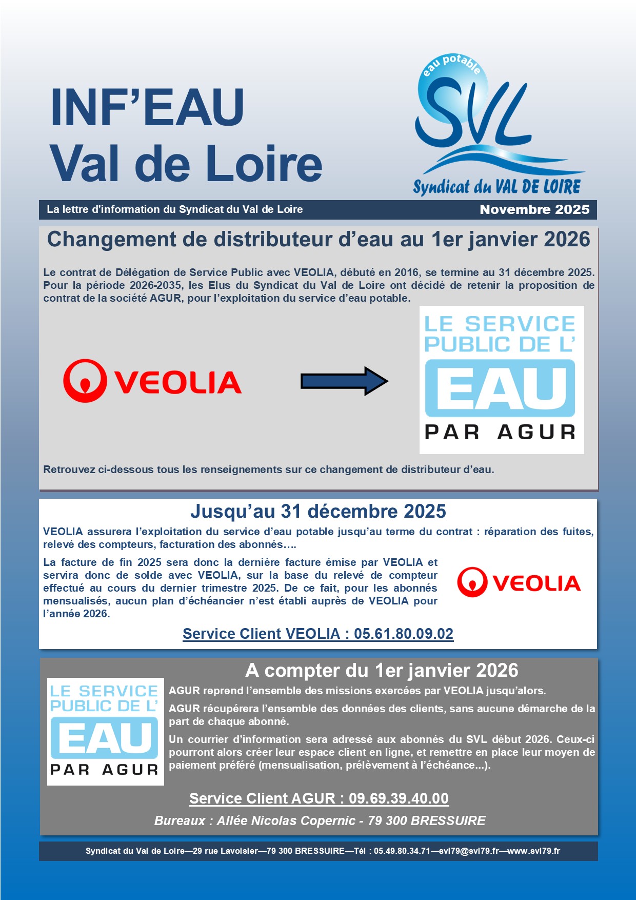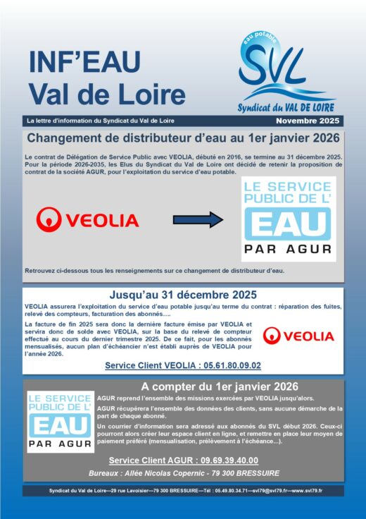 Au 31 décembre 2025, le contrat de délégation de service public pour la distribution de l’eau potable conclu entre Le Syndicat du Val de Loire et VEOLIA prendra fin. Par conséquent, les factures déjà arrivées, ou à venir d’ici la fin de l’année, et basées sur le relevé de votre compteur d’eau, soldent les prestations […]